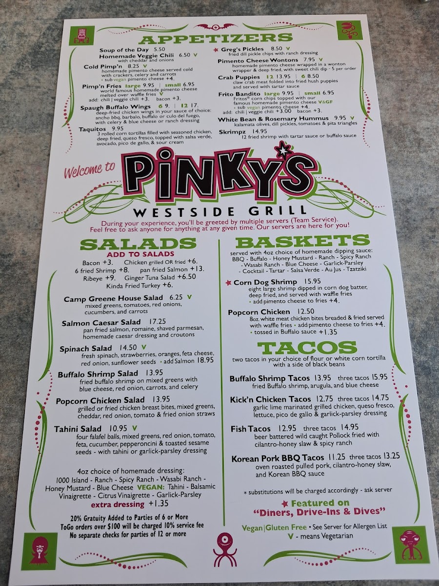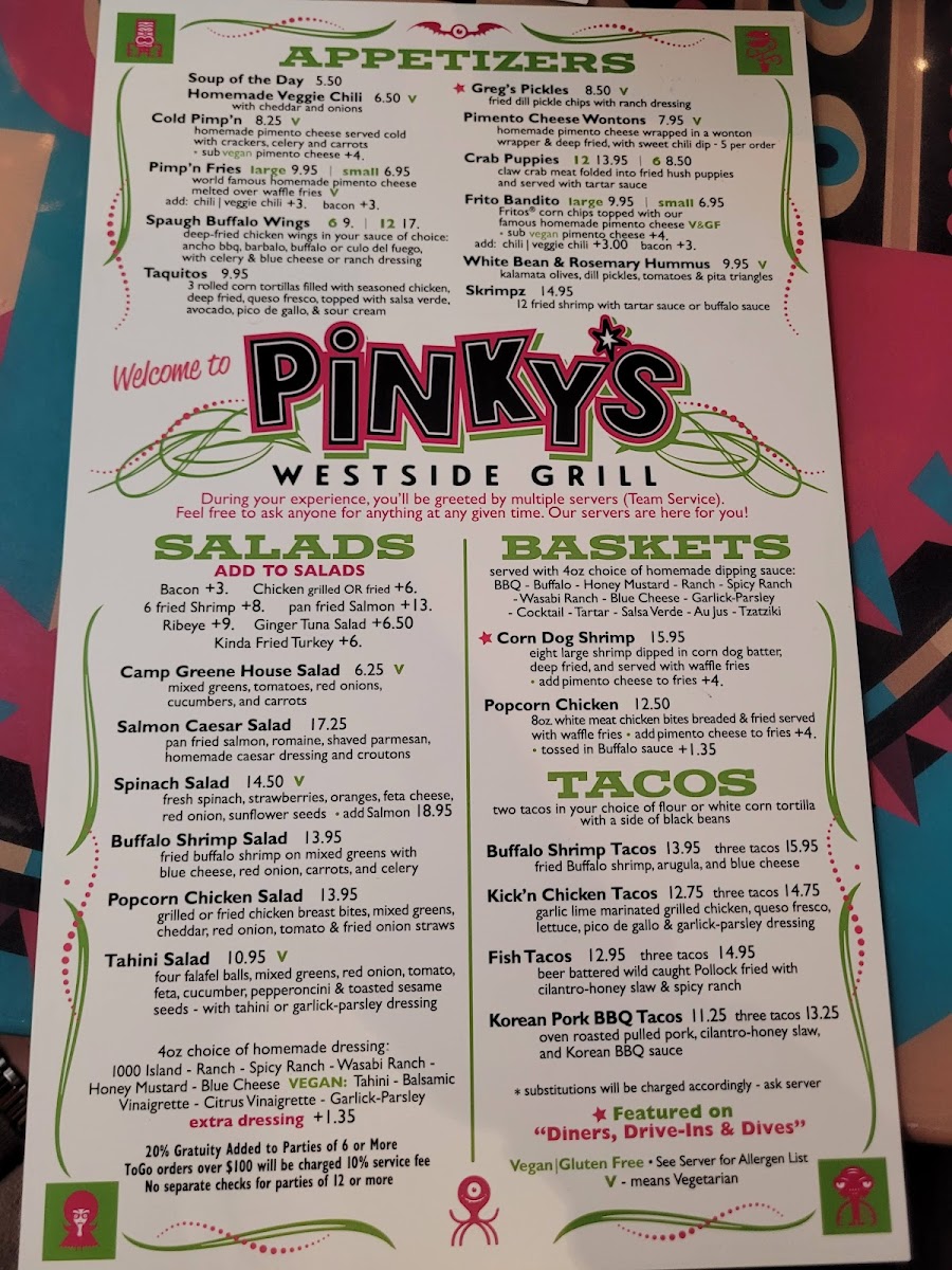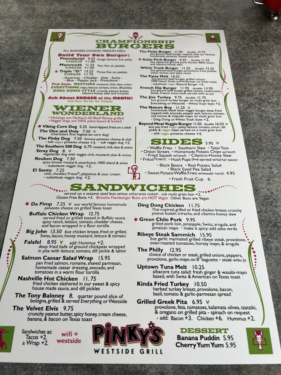 If you're in the mood for a great meal in Charlotte, look no further than Pinky's Westside Grill Menu. Located at 1600 W Morehead St, this spot offers a laid-back vibe with a menu full of mouth-watering options. From juicy burgers to fresh seafood, there’s something to satisfy every craving. The menu features a mix of classic comfort food and unique twists, with each dish crafted to perfection. Whether you're stopping by for a quick bite or hanging out with friends, Pinky’s makes it easy to enjoy a delicious meal. You can count on bold flavors, generous portions, and that perfect combination of quality and fun. It's the kind of place where you can kick back, dig into your favorite dish, and make some memories.