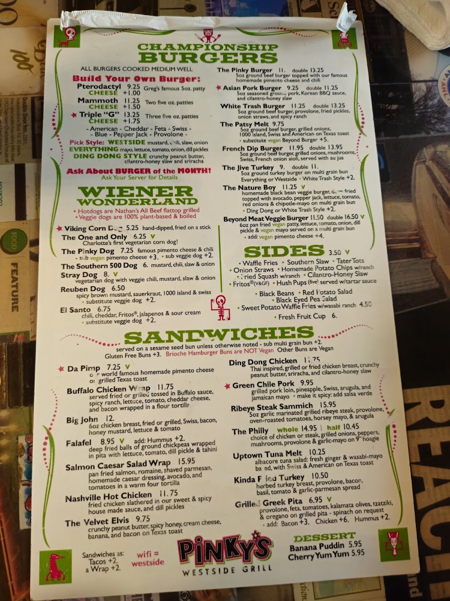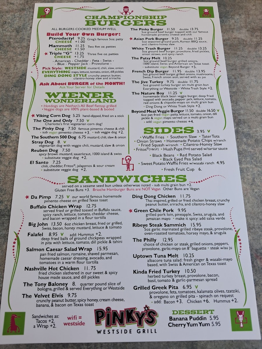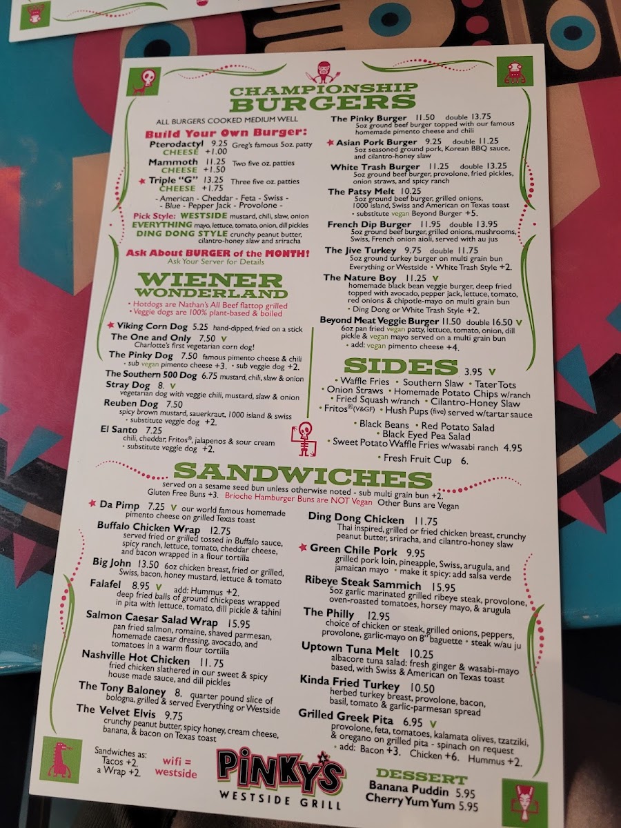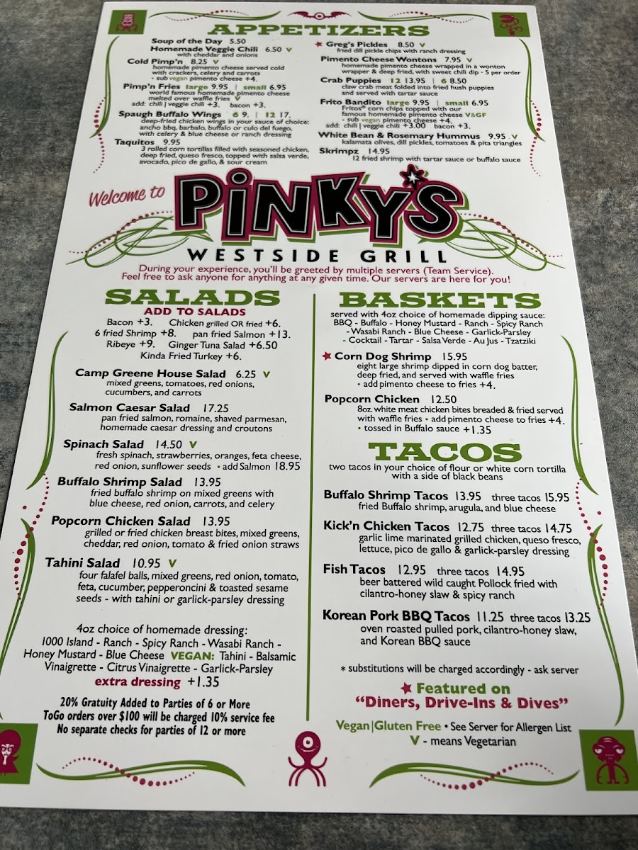 If you're in the mood for a great meal in Charlotte, look no further than Pinky's Westside Grill Menu. Located at 1600 W Morehead St, this spot offers a laid-back vibe with a menu full of mouth-watering options. From juicy burgers to fresh seafood, there’s something to satisfy every craving. The menu features a mix of classic comfort food and unique twists, with each dish crafted to perfection. Whether you're stopping by for a quick bite or hanging out with friends, Pinky’s makes it easy to enjoy a delicious meal. You can count on bold flavors, generous portions, and that perfect combination of quality and fun. It's the kind of place where you can kick back, dig into your favorite dish, and make some memories.